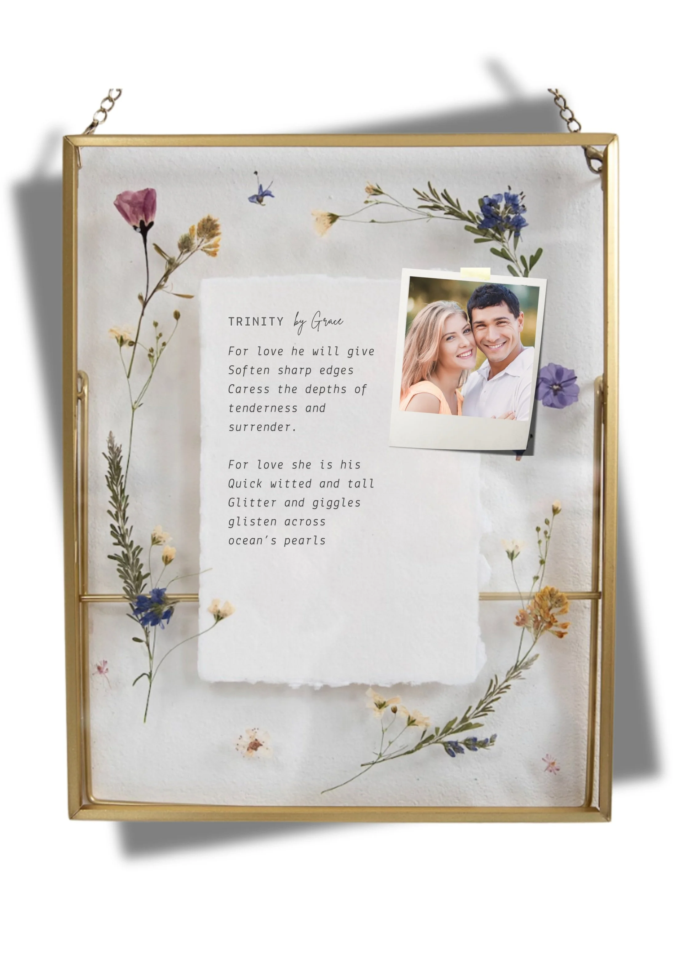Each poem comes elegantly framed in golden glass, adorned with dried flowers and a Polaroid photo of the couple.